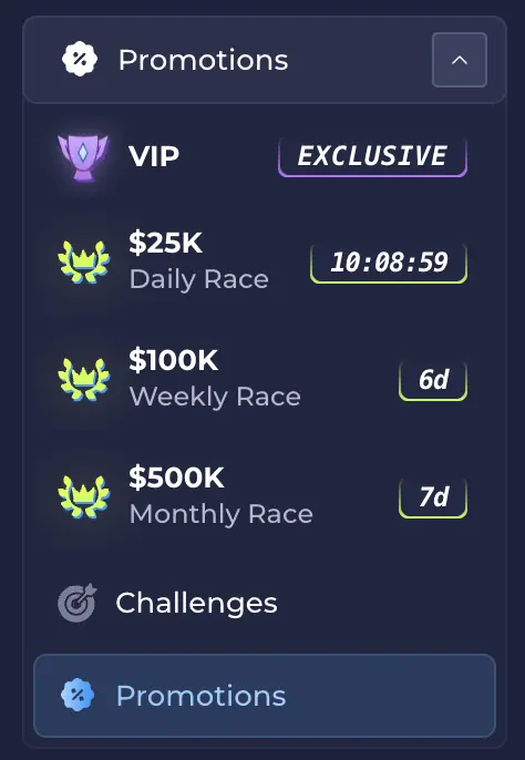 We bieden ook 3x Daily Reloads voor actieve spelers, zodat je bonussen over de dag kunt plannen. Als je van competitie houdt, zijn er toernooien met vaste prijzenpotten: de Daily Race biedt €23000.0, de Weekly Race biedt €92000.0 en de Monthly Race biedt €460000.0. Sportspelers hebben een extra voordeel omdat sportweddenschappen 3x het inzetbedrag meetellen voor leaderboard-races, wat een directe manier is om punten op te bouwen terwijl je wedstrijden volgt.